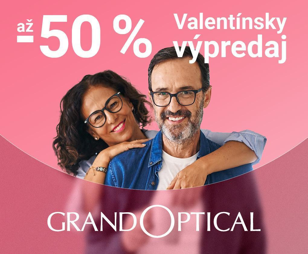 Príďte do predajne GrandOptical a kúpte si vo Valentínskom výpredaji nové dioptrické alebo slnečné okuliare so zľavou až 50 %. Akciu nie je možné kombinovať ani sčítať s inými akciovými ponukami alebo poukazmi. Ponuka platí do odvolania. Viac informácií v predajni alebo na www.grandoptical.sk